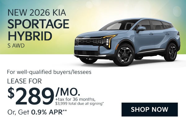 Lease a New 2026 Kia Sportage Hybrid S AWD for $289/mo OR Get 0.9% APR (STOCK# KN6430, MSRP $34,235) *Well-qualified lessees may lease for $289/mo for 36 months with $3,999 total due at signing (includes down payment, $0 first monthly payment, bank acq fee, $784 doc & title prep fees, $0 security deposit). Sales tax, title, reg fees additional. Closed end lease. 10,000 miles/year. Lease end purchase option $24,306. See dealer for complete lease details. **Well-qualified buyers may choose 0.9% limited term annual percentage rate financing (60 months) through Kia Finance America. No down payment required. ALL OFFERS: Not all will qualify. All incentives to dealer, cannot be combined with other offers. Take delivery by 5/4/2026.